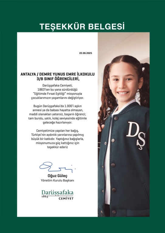 Okulumuz 3/B sınıfı öğrencileri, yaz tatili süresince kumbaralarında biriktirdikleri paraları anlamlı bir sosyal sorumluluk projesine dönüştürdü. Topladıkları parayı sınıfça Darüşşafaka’ya bağışlayan öğrencilerimiz, “paylaşmanın ve yardımlaşmanın yaşı olmaz” mesajını verdiler. Bu davranış, yalnızca maddi bir katkı olmanın ötesinde; dayanışma, empati ve sosyal sorumluluk bilincinin küçük yaşlarda da filizlenebileceğini gösterdi.
