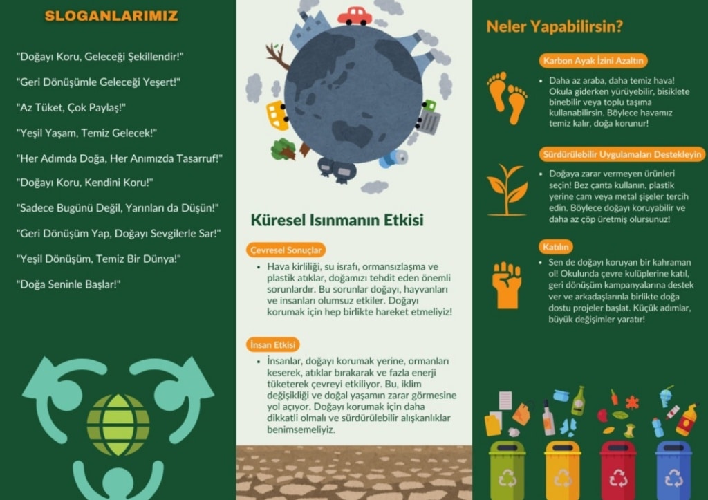- Bilgilendirici Panolar: Okul panolarımızda, öğrencilerimizin ilgisini çekecek görseller ve bilgilerle projemiz hakkında detaylı bilgi verilmektedir. Bu sayede öğrencilerimiz, çevre sorunları ve çözüm önerileri hakkında daha fazla bilgi sahibi olmaktadır.